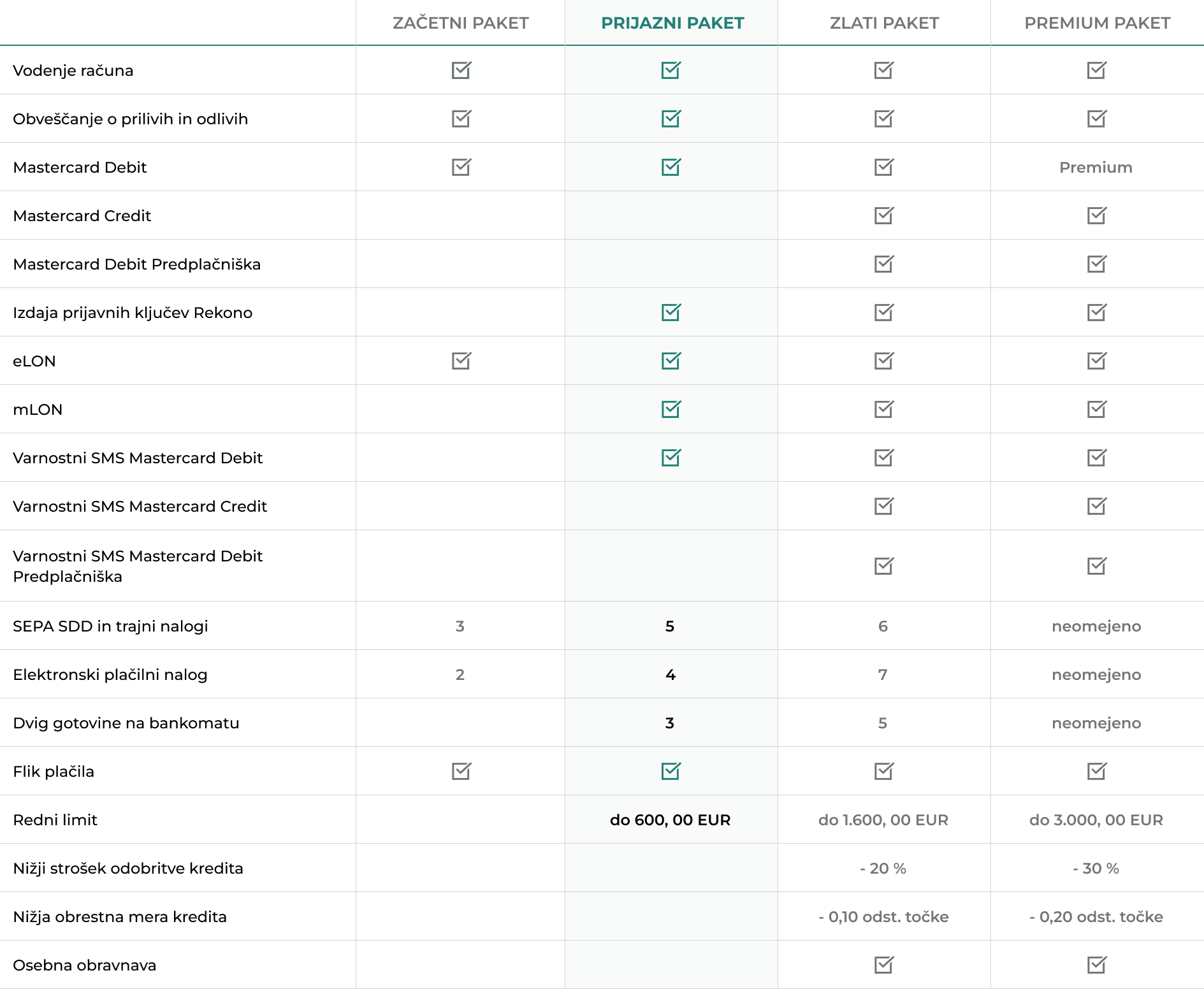 Ker vam želimo približati bančne storitve, smo v en paket združili vse najbolj pogoste storitve, ki jih sodobni komitent uporablja. Najboljše pri tem je, da za izbrane storitve plačujete le mesečni strošek vodenja paketnega računa – strošek je tudi nižji, kot pa če bi vse izbrane storitve uporabljali posebej.